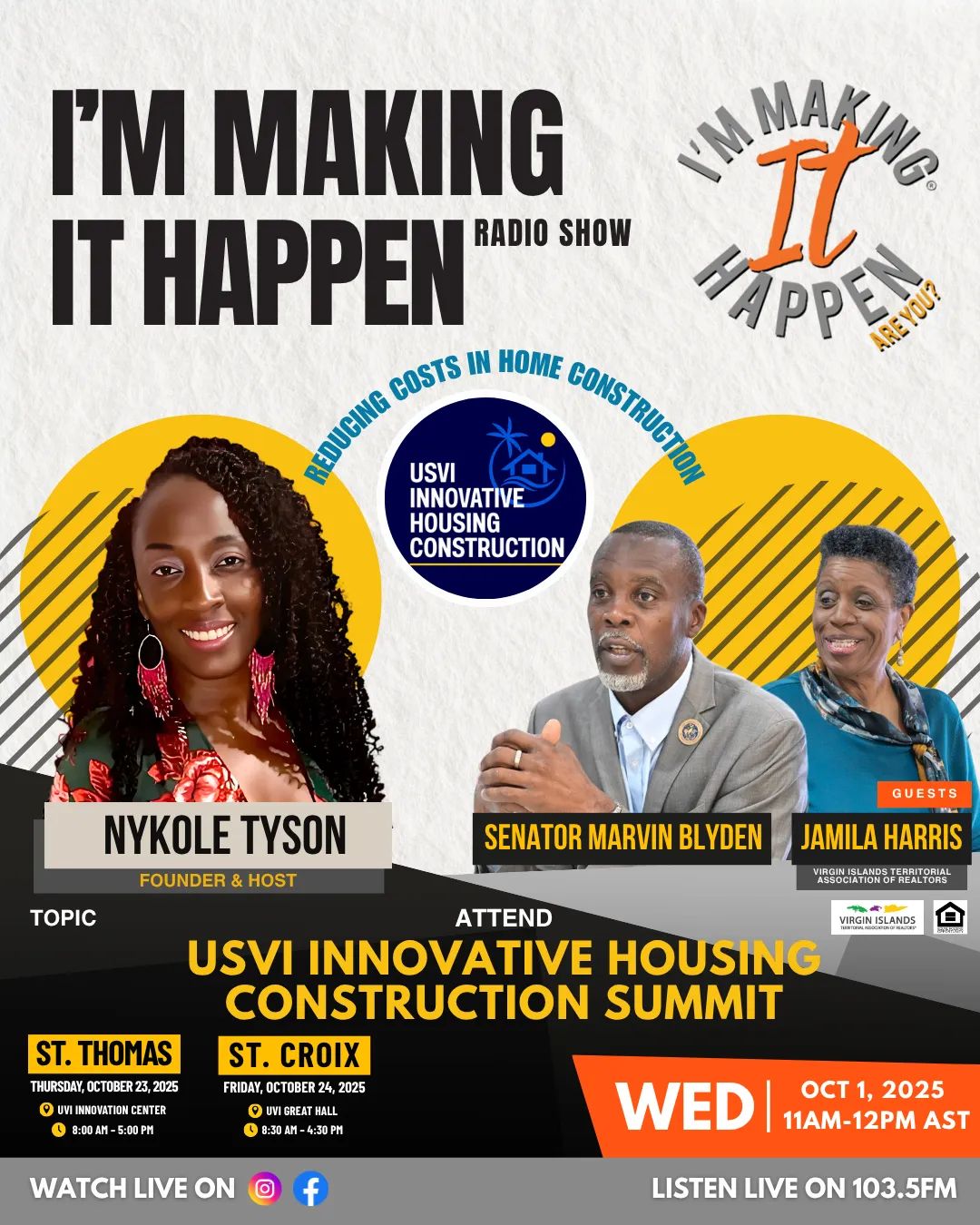 On this episode of the I’m Making It Happen Radio Show, we are joined by Senator Marvin Blyden and Jamila Harris of VITAR, who share innovative and affordable options to reduce the cost of home construction in the USVI. Learn about the Innovative Housing Construction summit that will show the technology that can make that happen
