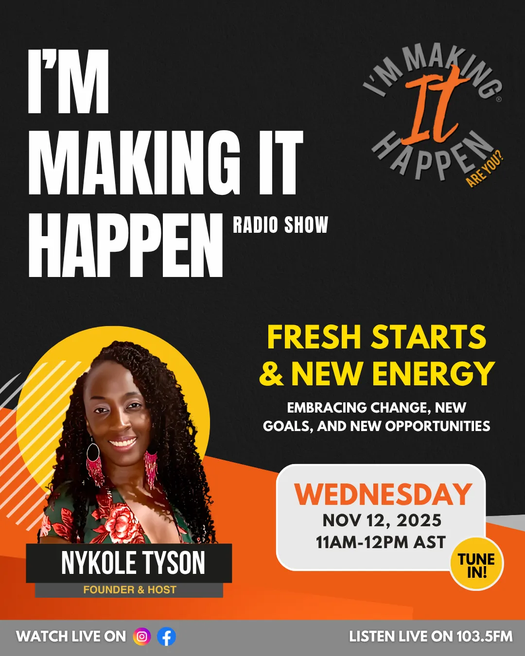 On this episode of the I’m Making It Happen Radio Show, Nykole Tyson discusses the latest events, uplifting conversations, Fresh Starts, and New Energy — embracing change, setting new goals, and creating new opportunities.