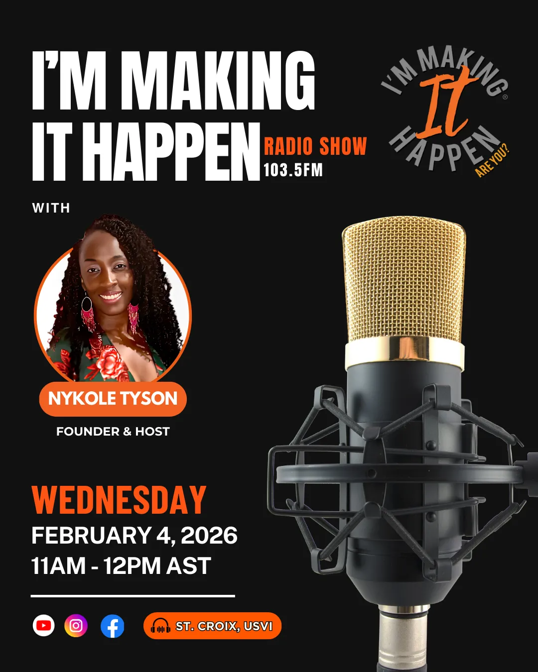 Join Nykole Tyson on the I’m Making It Happen radio show as we talk about what VI Pride really means and how it shows up in everyday actions. From road safety and littering to respect, education, and leading by example, this conversation focuses on accountability and building a stronger Virgin Islands community together.
