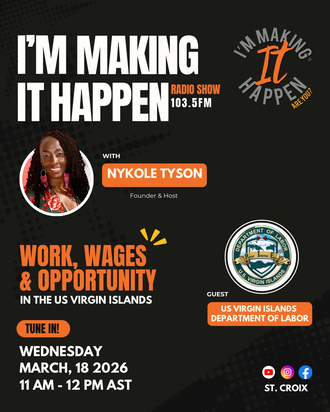 In this episode of the I’m Making It Happen Radio Show with Nykole Tyson, Assistant Commissioner Nesha Christian Hendrickson from the USVI Department of Labor shares updates on jobs, digital upgrades, and the Summer Youth Work Experience Program. Learn how students and employers can get involved and what opportunities are available across the Virgin Islands.
